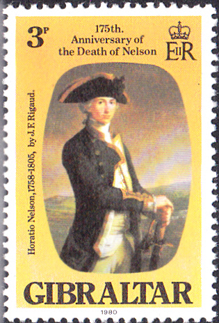 Hier eine Marke aus Gibraltar (MiNr 409) mit einem Gemälde von John Francis Rigaud (1742-1810). Zu sehen ist der Admiral Lord Horatio Nelson (1758-1805) mit einem Dreispitz.
