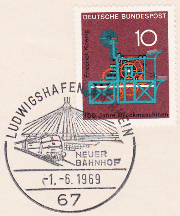 Dieser Sonderstempel aus Ludwigshafen am Rhein vom 1.6.1969 dokumentiert die Eröffnung des Bahnhofes. Im Stempelbild wird die Schrägseilbrücke gezeigt, die den Bahnhof in einer Höhe von 14 Meter überquert. Das eigentliche Bahnhofsgebäude ist unterhalb der Brücke erkennbar. Das Empfangsgebäude liegt zum Teil unterhalb der Hochbahnsteige.