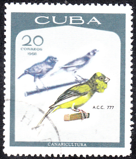 Aus einer Serie "Kanarienvogelzucht" aus Kuba stammt diese Marke (MiNr 1394) mit einem preisgekrönte Kanarienvögel. Auf der Marke ist vermutlich seine "Registriernummer" angegeben.