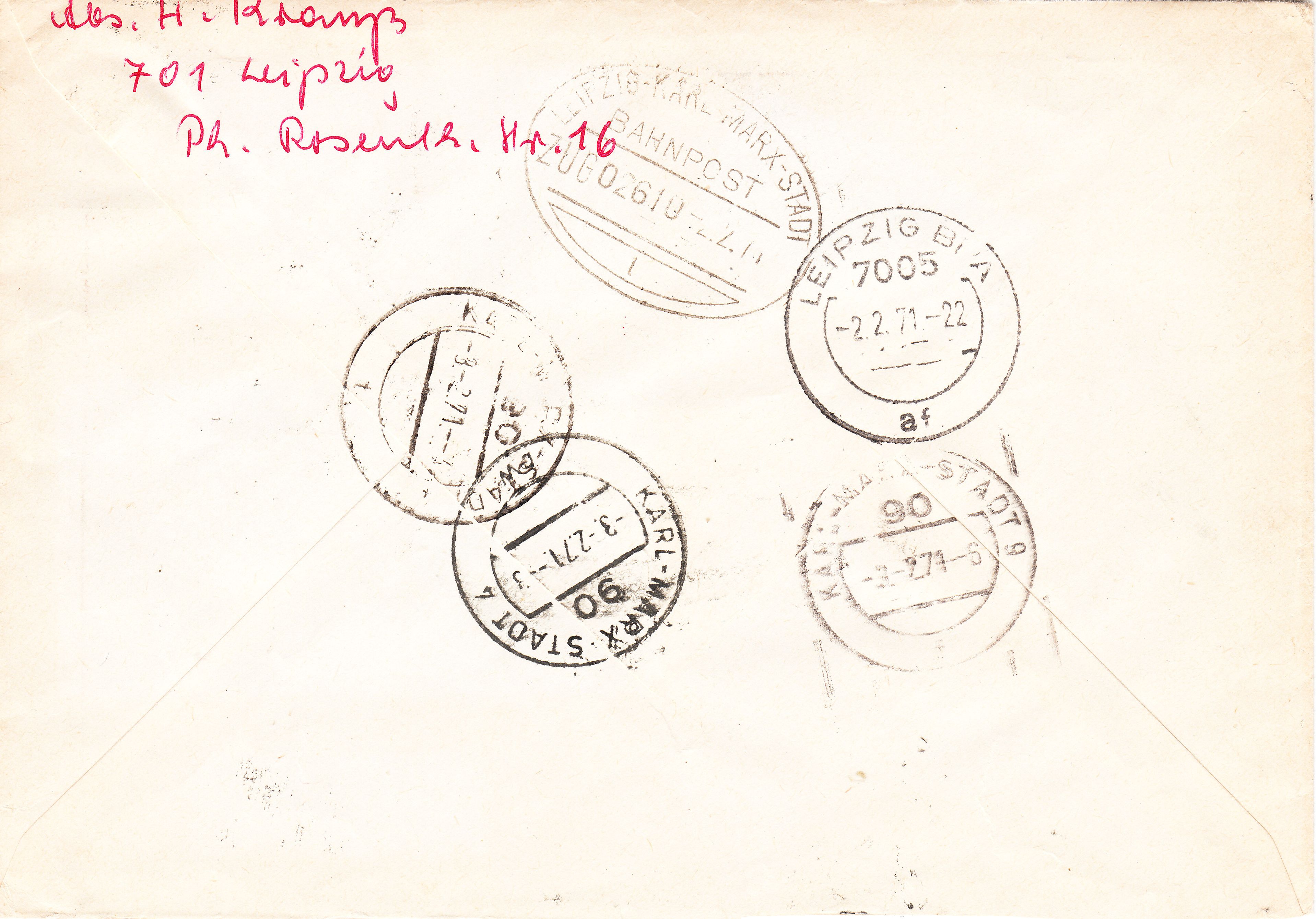 Auf der Rückseite findet sich ein Bahnpoststempel "LEIPZIG - KARL-MARX-STADT ZUG 02610":