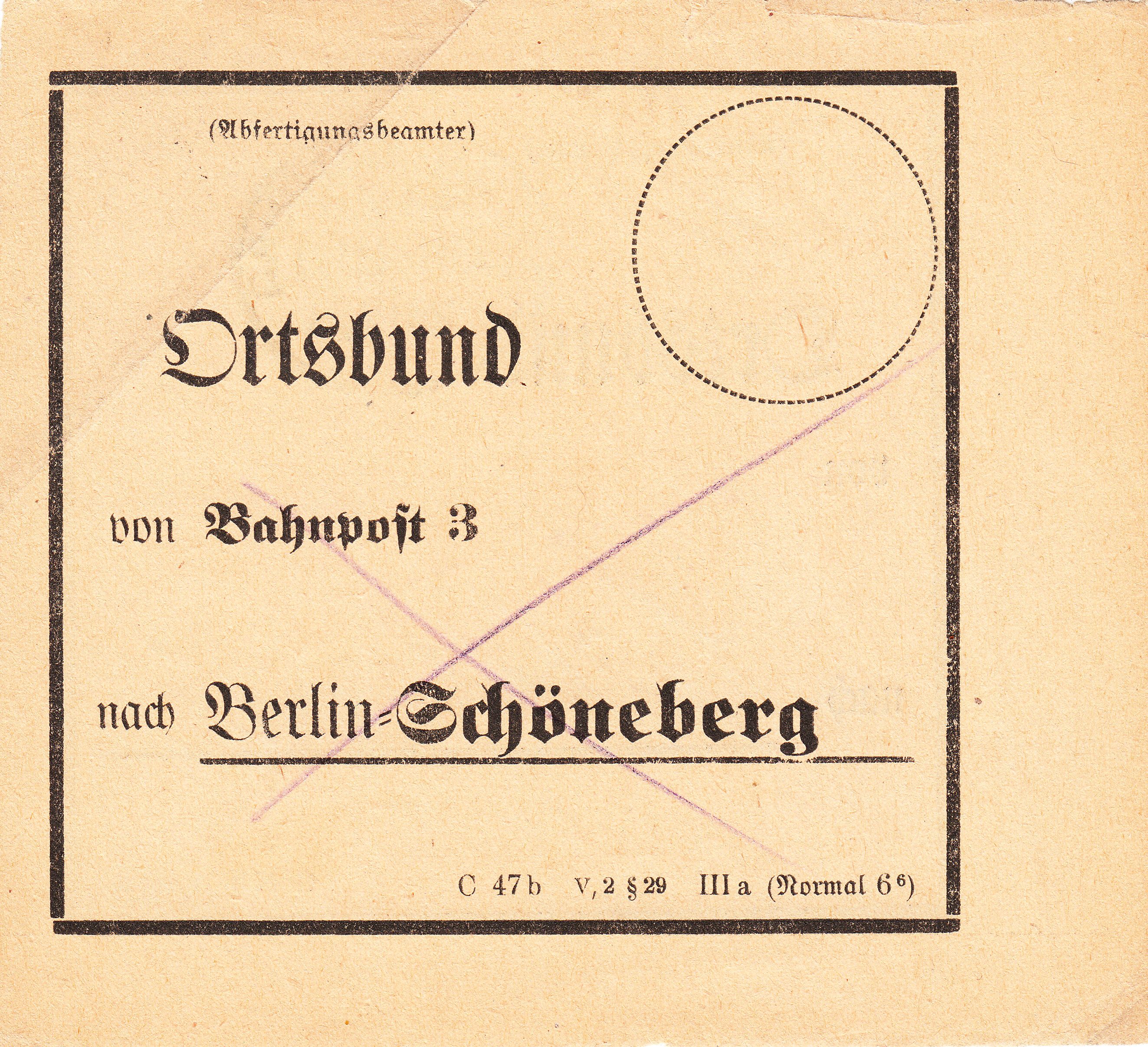 Ein für die "Bahnpost 3"gedrucktes Formular für einen "Ortsbund" nach "Berlin-Schöneberg" wurde verwendet und rückseitig wurde ein allgemeines Formular "Ortsbund" aufgedruckt.