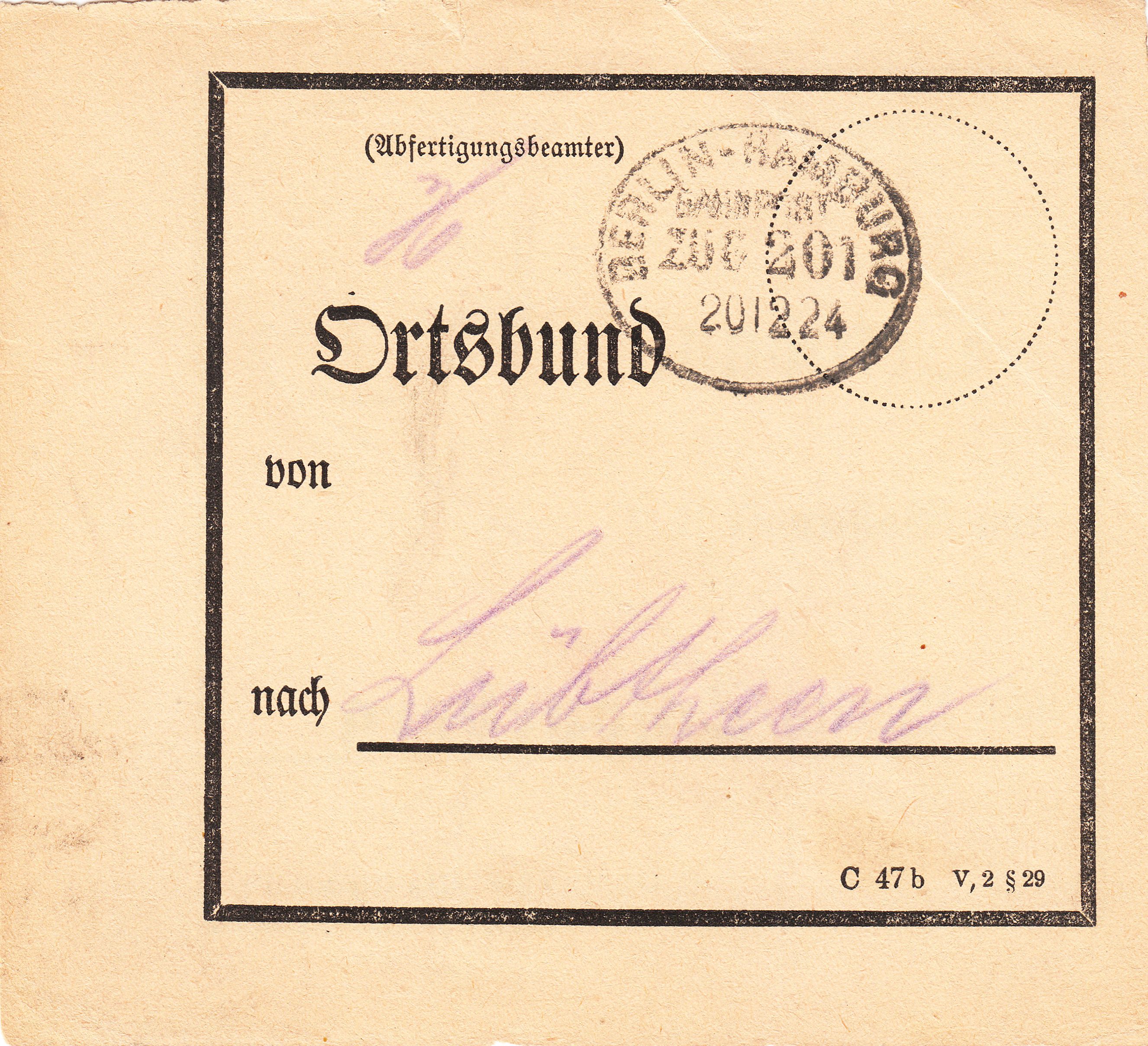 Daamit dieses Exemplar auch perfekt zum Thema Bahnpost passt wurde dieses Formular im ZUG 201 auf der Strecke ""BERLIN-HAMBURG" verwendet und der damit versehene Ortsbund ging nach "Lübtheen".