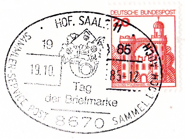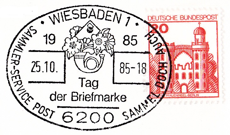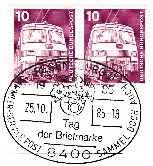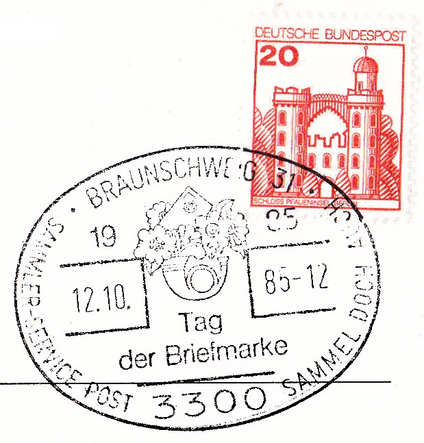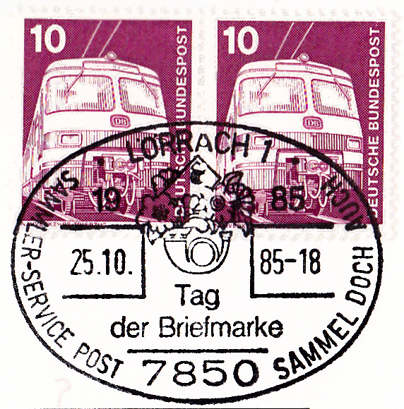 Der Sammler-Service der Post beteiligte sich an den Aktionen zum Tag der Briefmarke 1985 auch mit zahlreichen bildgleichen Sonderstempel. Hier der Stempel vom 5.10.1985 aus Bad Oldesloe.