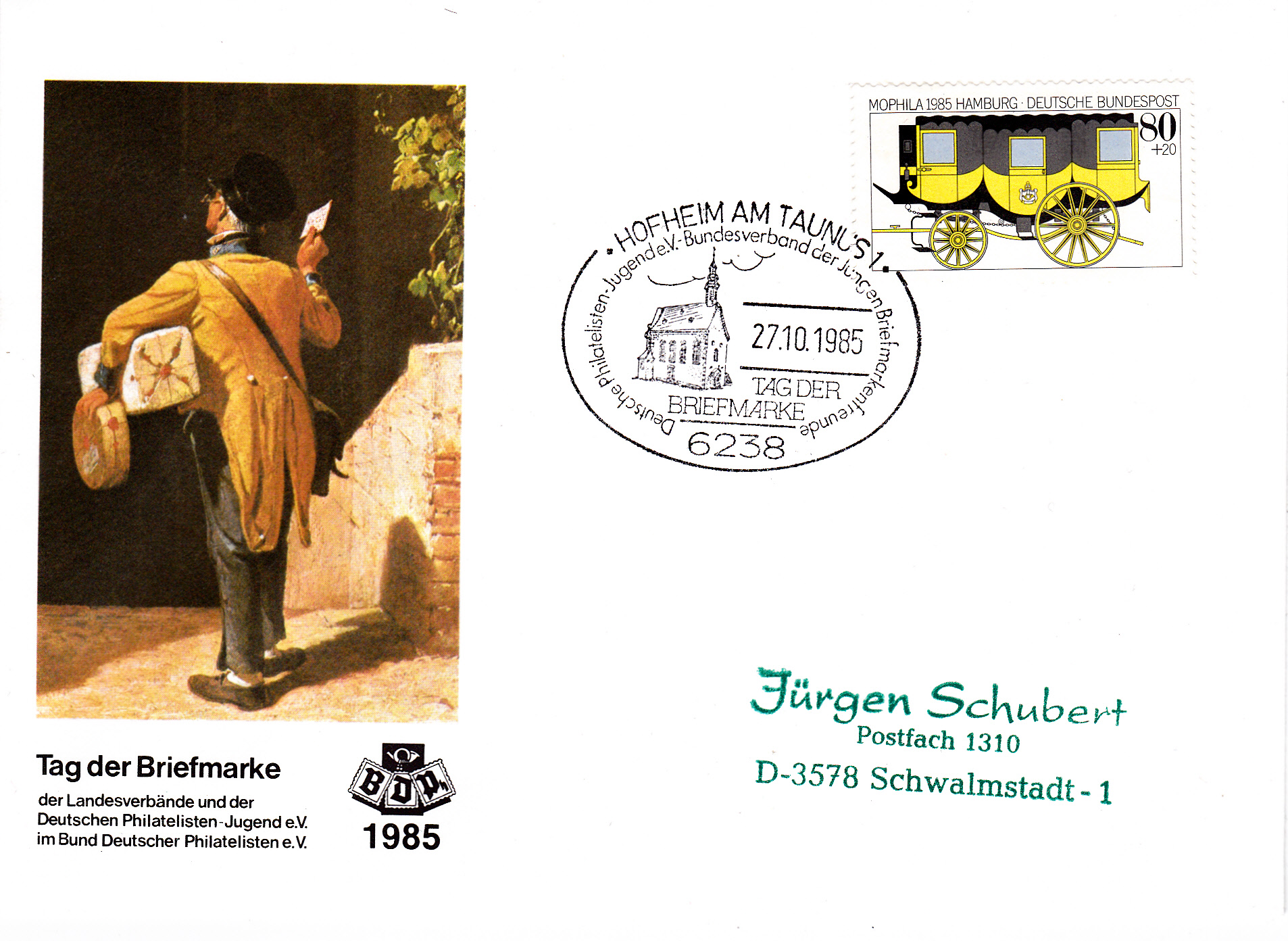 Sonderstempel der Deutschen Philatelisten Jugend e.V. zum Tag der Briefmarke 1985 vom 27.10.1985 aus Hofheim am Taunus auf einer zum Stempelmotiv passenden Privatganzsache.
