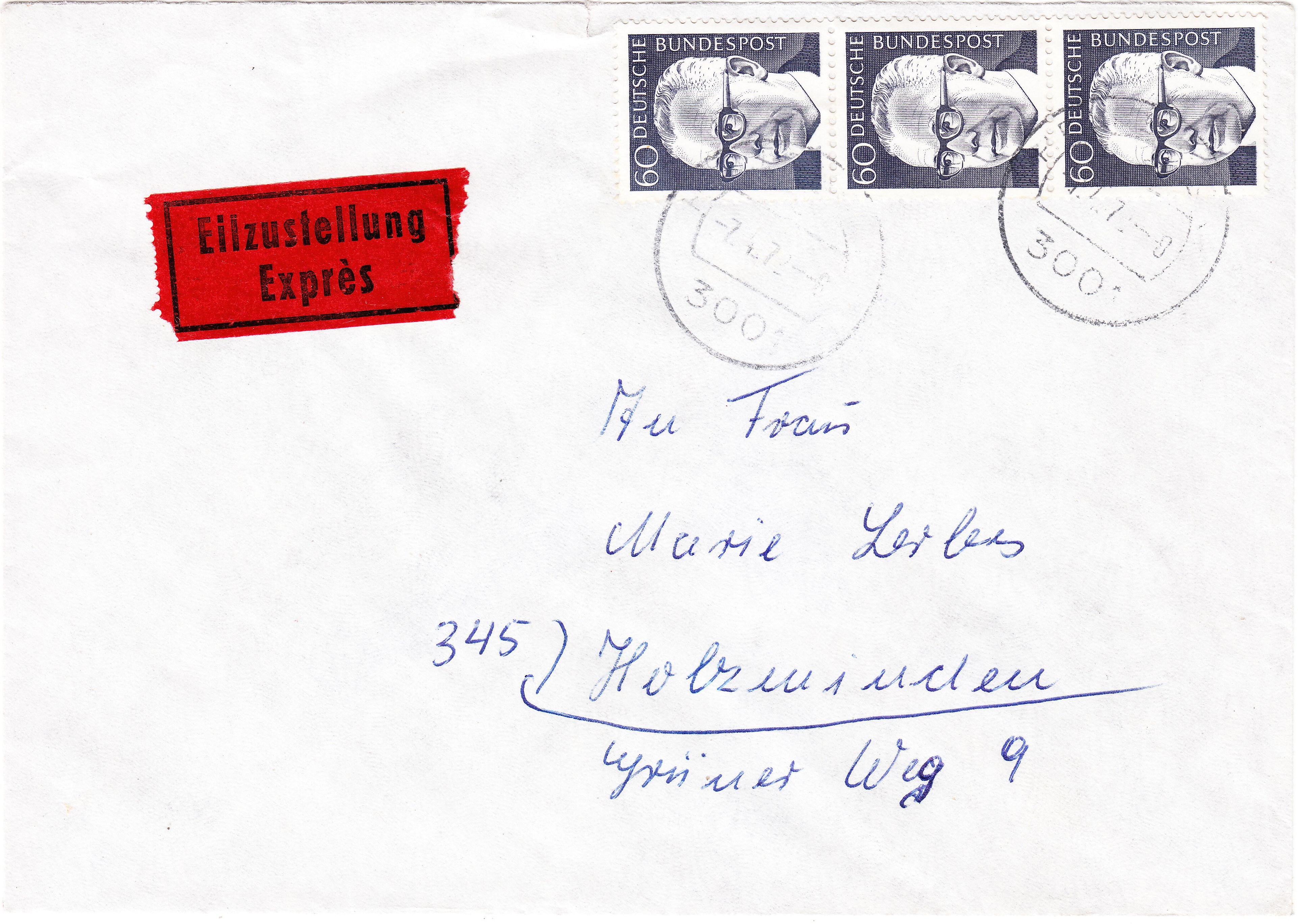 Dieser Brief im Fernverkehr bis 20 Gramm (30 Pf) per Eilzustellung (150 Pf) wurde am 07.04.1972 portorichtig per MeF mit einem senkrechten Dreierstreifen des 60 Pf Wertes der Dauerserie Heinemann freigemacht: