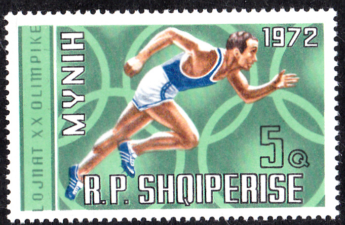 Bereits 1971 war eine weitere Markenserie zu den Olympischen Spielen 1972 in ALbanien erschgienen. Hier der erste Wert dieser Serie (MiNr 1499) mit einem Sprinter beim Start.