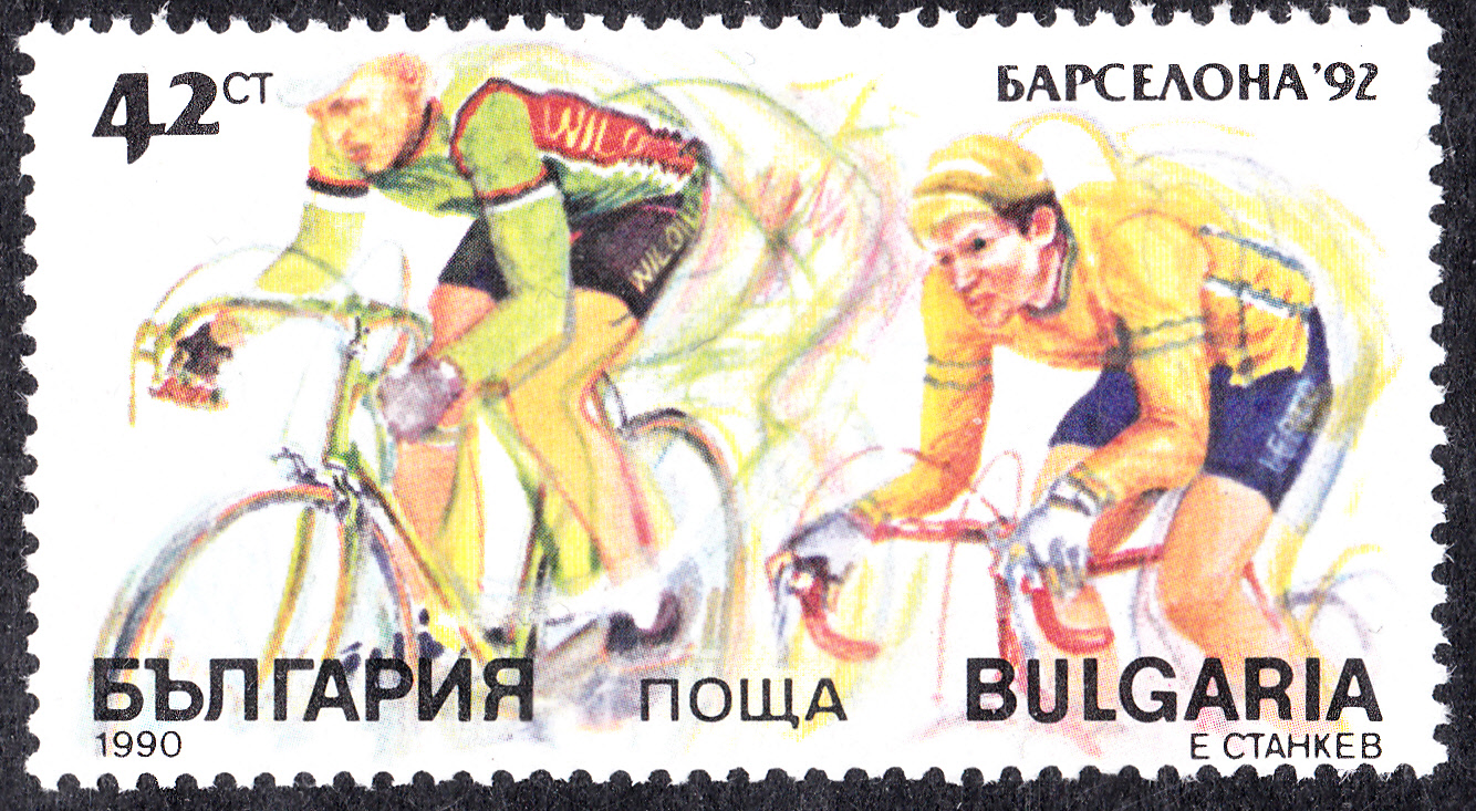 Diese Marke aus Bulgarien (MiNr 3849) zeigt zwei Radrennfahrer.