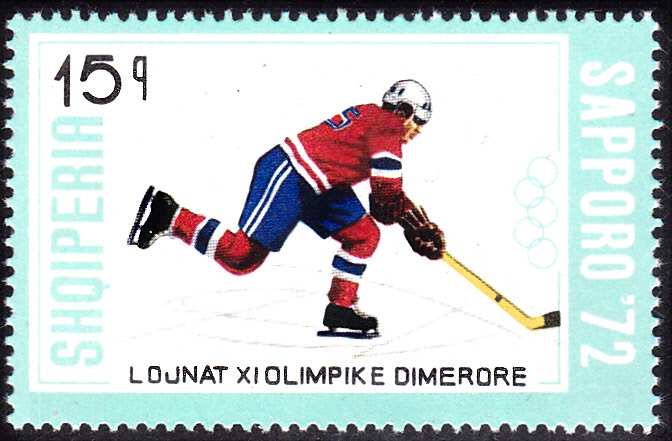 Aus Albanien kommt diese Marke (MiNr 1529) zu den Winterspielen 1972 mit einem Eishockeyspieler.