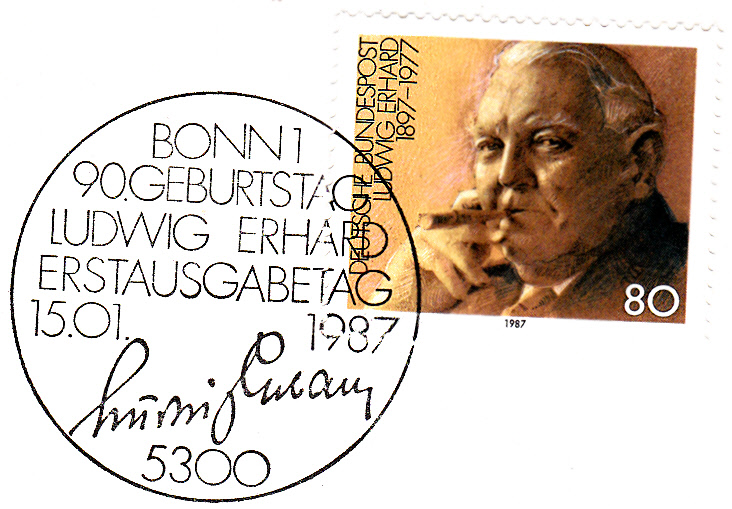 Die zum 90. Geburtstag von Ludwig Erhard erschienene Marke der Deutschen Bundespost (MiNr 1308) wurde hier mit dem Ersttagsonderstempel Bonn, der die Unterschrift von Erhard zeigt, gestempelt.