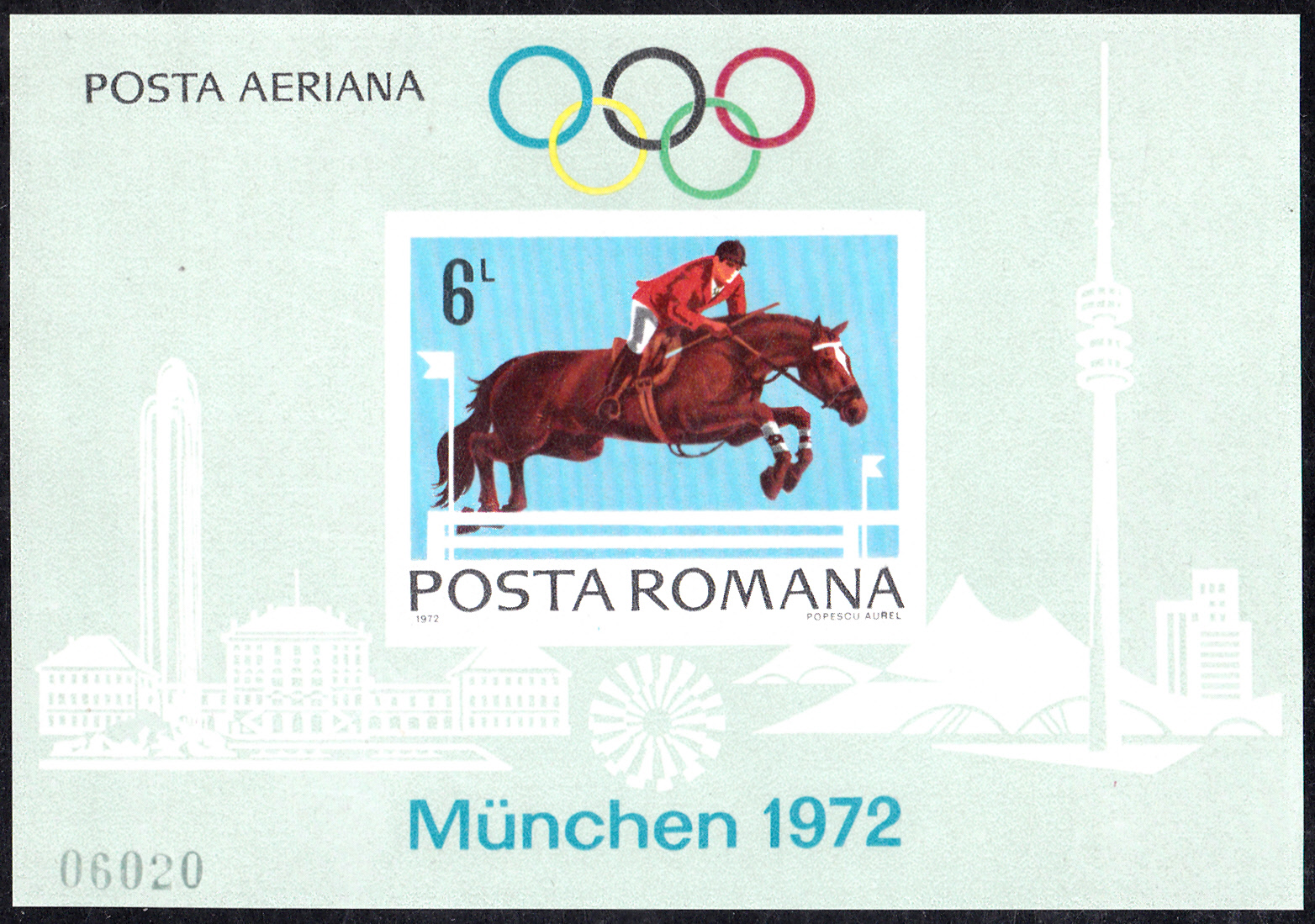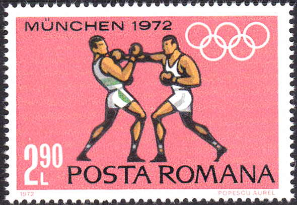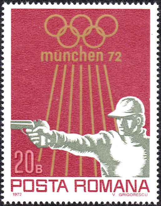 Es folgt die Marke zu 20 Bani (MiNr 3036) mit einem Pistolenschützen.