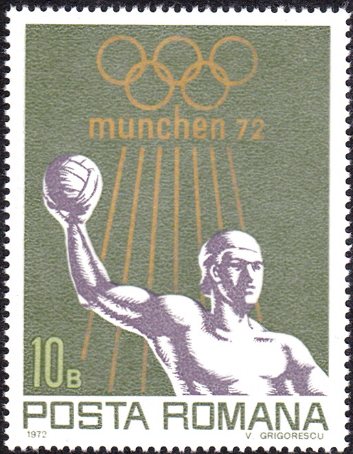 In einer zweiten Serie sind in Rumänien im Juli 1972 weitere Marken erschienen. Hier die Marke zu 10 Bani (MiNr 3035) mit einem Spieler beim Wasserball: