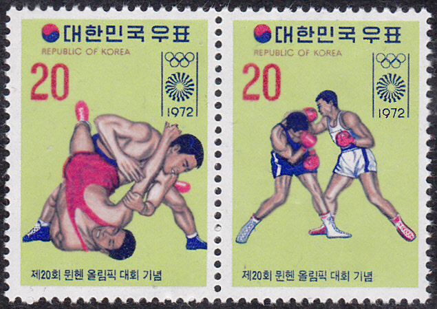 Eine weitere Marke aus Korea-Süd (MiNr 847) bildet eine Szene beim Ringen ab.