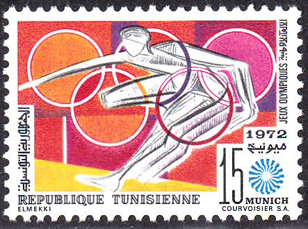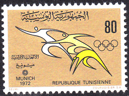 Zu den Sommerspielen in München erschien in Tunesien eine Serie mit sechs Marken. Diese Marke (MiNr 781 A) zeigt eine symbolische Darstellung zum Volleyball.