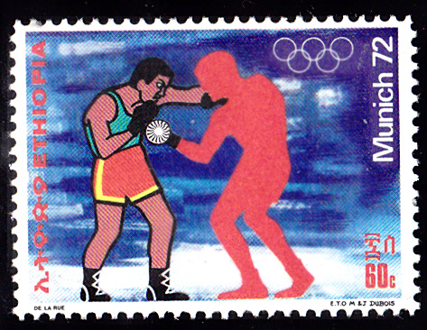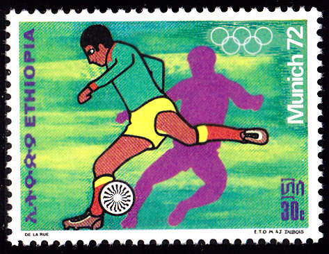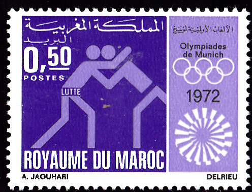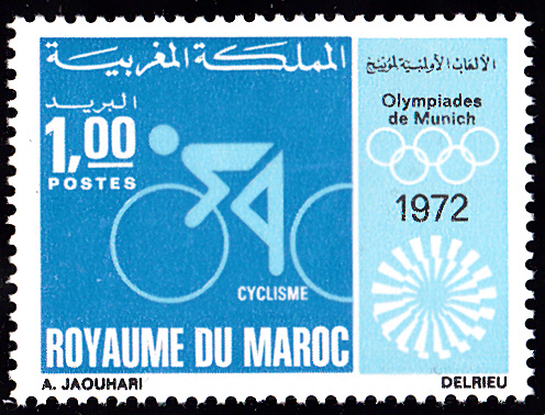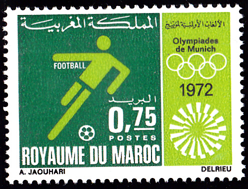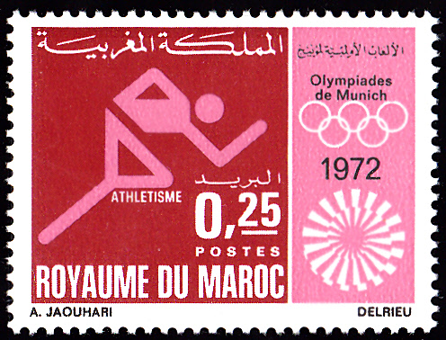 Aus Marokko kamen 35 Teilnehmer zu den Sommerspielen 1972 nach München. In Marokko erschienen in einer Serie zu den Spielen vier Marken mit Piktogrammen. Hier die erste Marke (MiNr 708) mit dem Piktogramm für "Leichtathletik".