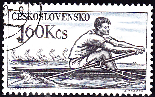 Obwohl auf dieser Marke aus der Tschechoslowakei (MiNr 1120) nur ein Ruderer in Vordergrund zu sehen ist, handelt es sich um einen Achter (wie an dem Boot im Hintergrund zu erkennen ist).