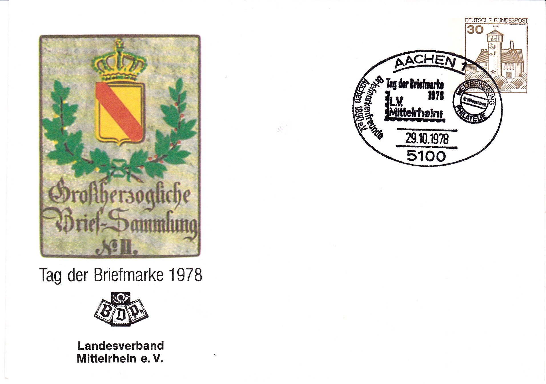 Ganzsachenumschlag des Landesverbandes Mittelrhein e.V. zum Tag der Briefmarke 1978 mit dem dazu passenden Sonderstempel aus Aachen.