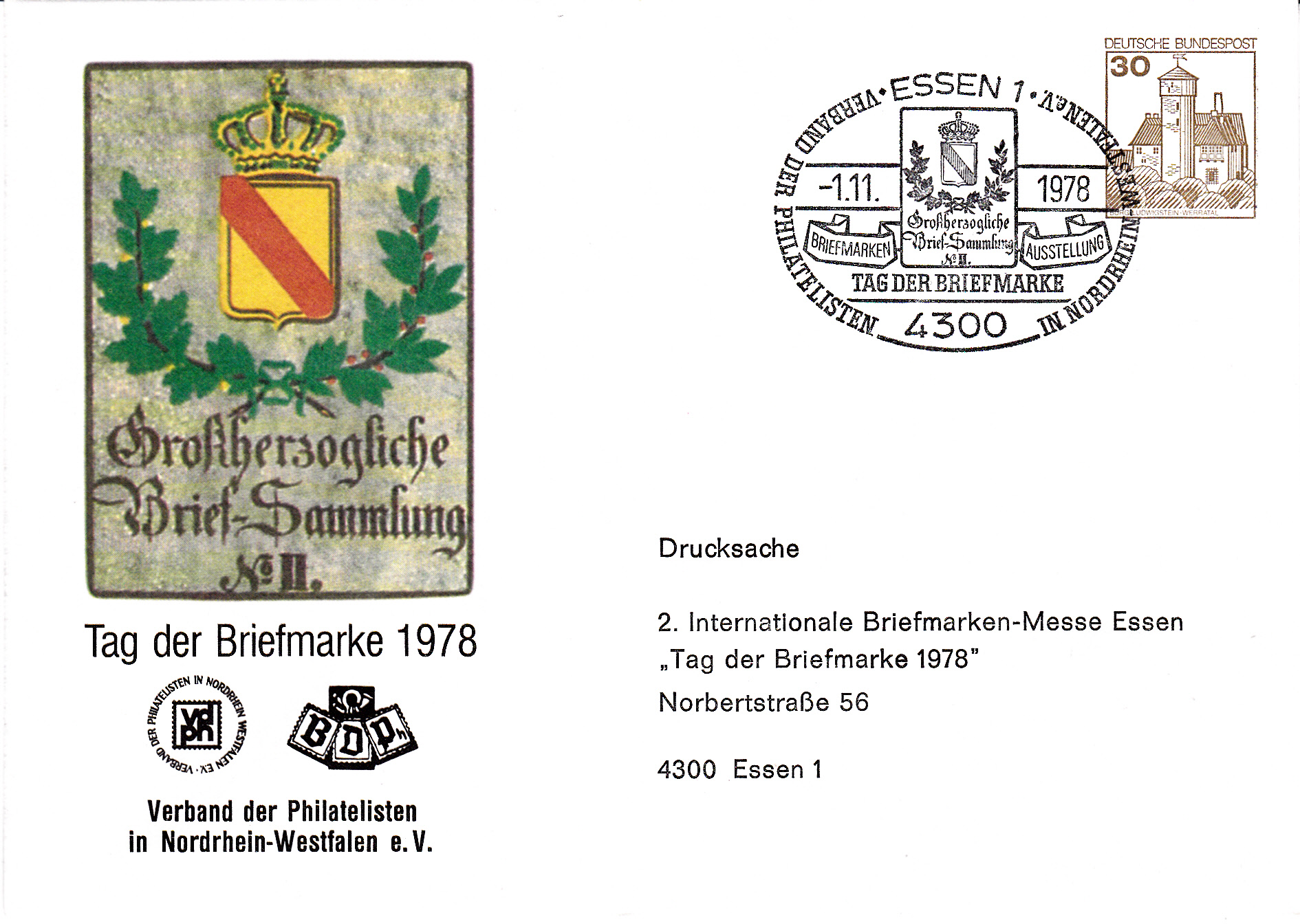 Ganzsachenumschlag des Verbandes der Philatelisten in Nordrhein-Westfalen e.V. zum Tag der Briefmarke 1978 mit dem dazu passenden Sonderstempel vom 01.11.1978 aus Essen.