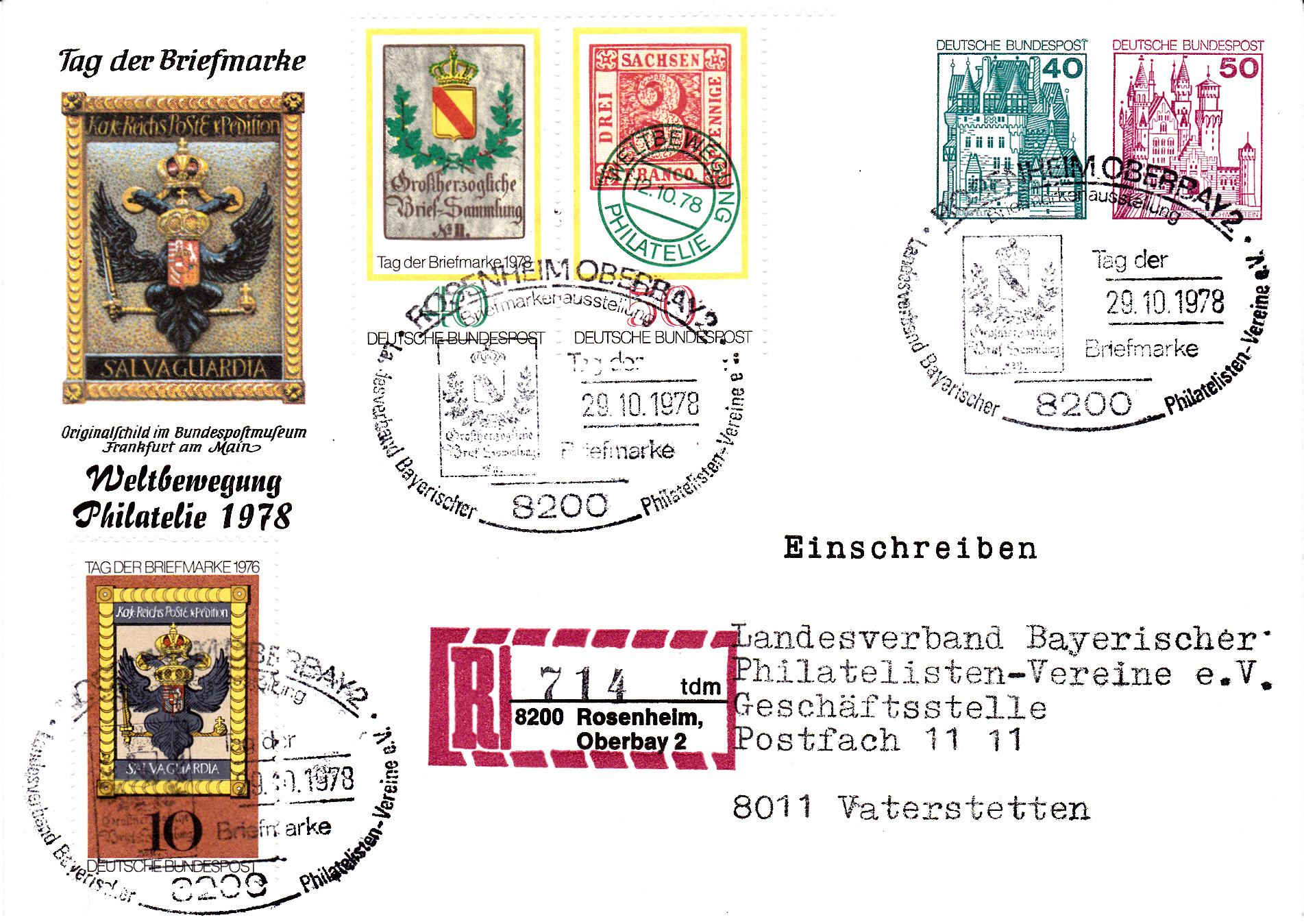 Diese Privatganzsache zum Tag der Briefmarke mit Wertstempel zu 40Pf und 50Pf und eingedrucktem Einschreibzettel 8200 Rosenheim, Oberbayern und Zusatzfrankatur ist beim Tag der Briefmarke am 29.10.1978 in Rosenheim gestempelt worden.