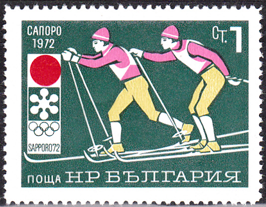 Auf einer Marke aus Bulgarien (MiNr 2114) zu den Spielen 1972 in Sapporo sind zwei Langläufer eines Staffellaufes beim Wechsel zu sehen.