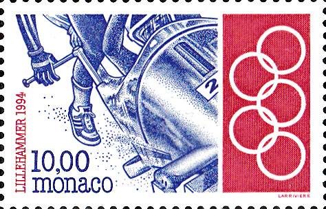 Auf der Marke zu den Olympischen Jugend-Winterspielen 2016 in Lillehammer aus Monaco (MiNr 3276) wird auch ein Zweierbob gezeigt. Hier eine Marke von rechten oberen Bogenrand: