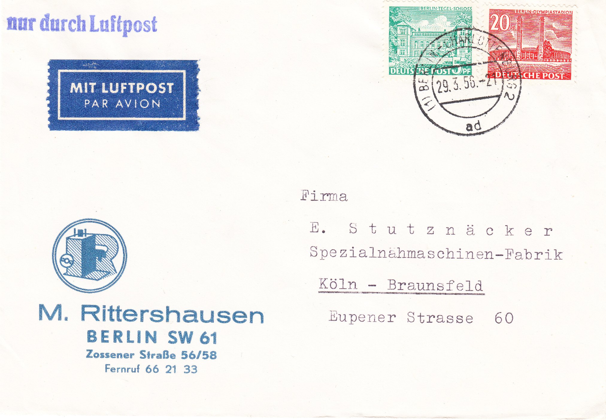 Dieser nach Ansbach in Mittelfranken adressierte, am 17.11.1950 in BERLIN-WILMERSDORF aufgegebene Brief wurde per Inlandsluftpost von Berlin nach Nürnberg befördert: