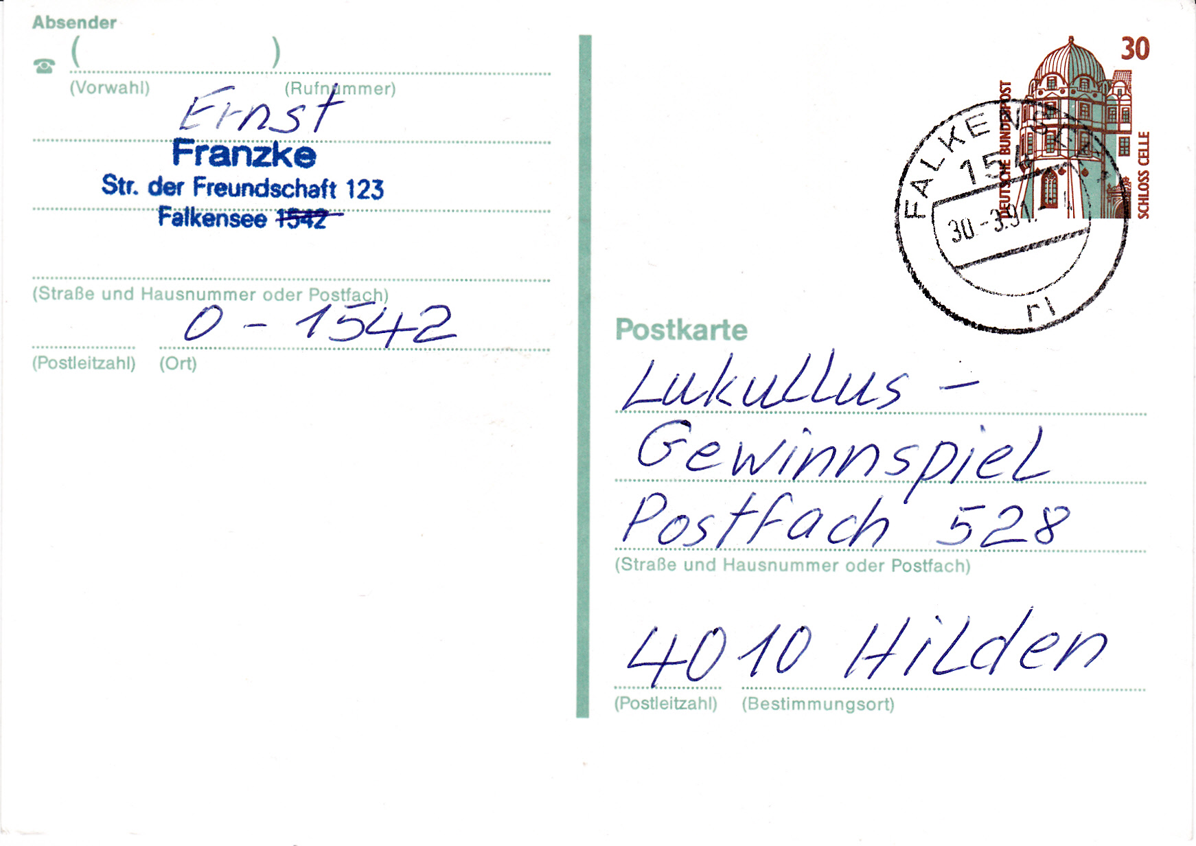Nach der Einführung der DM am 1.7.1990 galten im sogenannten Verkehrsgebiet Ost vom 1.7.1990 bis zum 31.3.1991 eigene Posttarife. Für eine Postkarte betrug das Porto 30Pf.