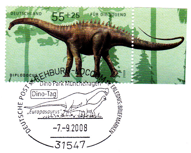 Auf diesem Sonderstempel aus Rehburg-Loccum vom 7.9.2008 sind zwei Europasaurus abgebildet. Der Stempel wurde bei einer SoPoFi im Dinopark Münchehagen geführt.