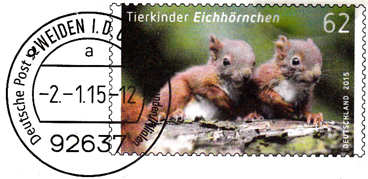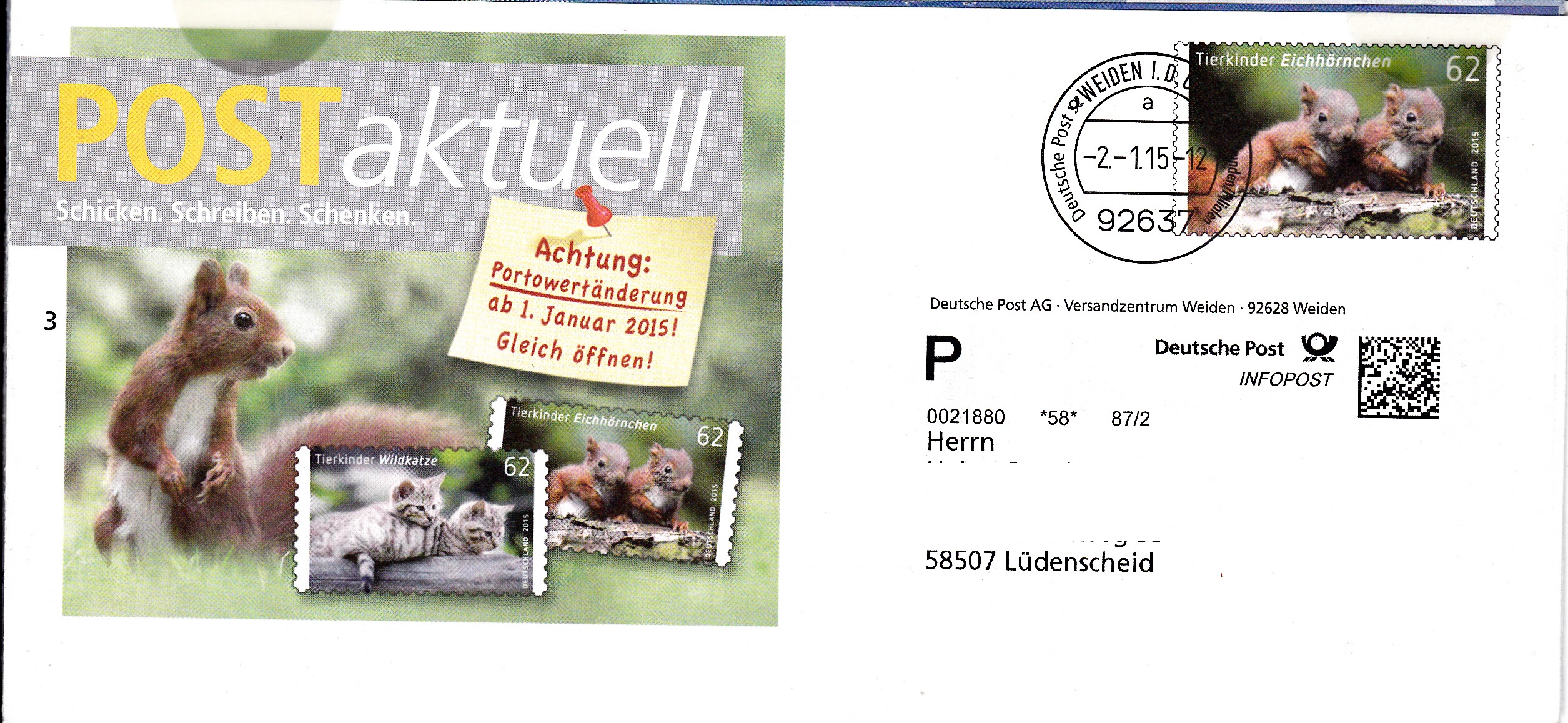 Faltbrief 210 mm x 102 mm mit Wertstempel "Tierbabys - Europäisches Eichhörnchen (Sciurus vulgaris)" (MiNr 3124) mit aufgedruckter Zähnung und Vorausentwertung "Deutsche Post (Posthorn) WEIDEN I.D.OPF (Posthorn) Privatkunden/Filialen / a / -2.-1.15-12".