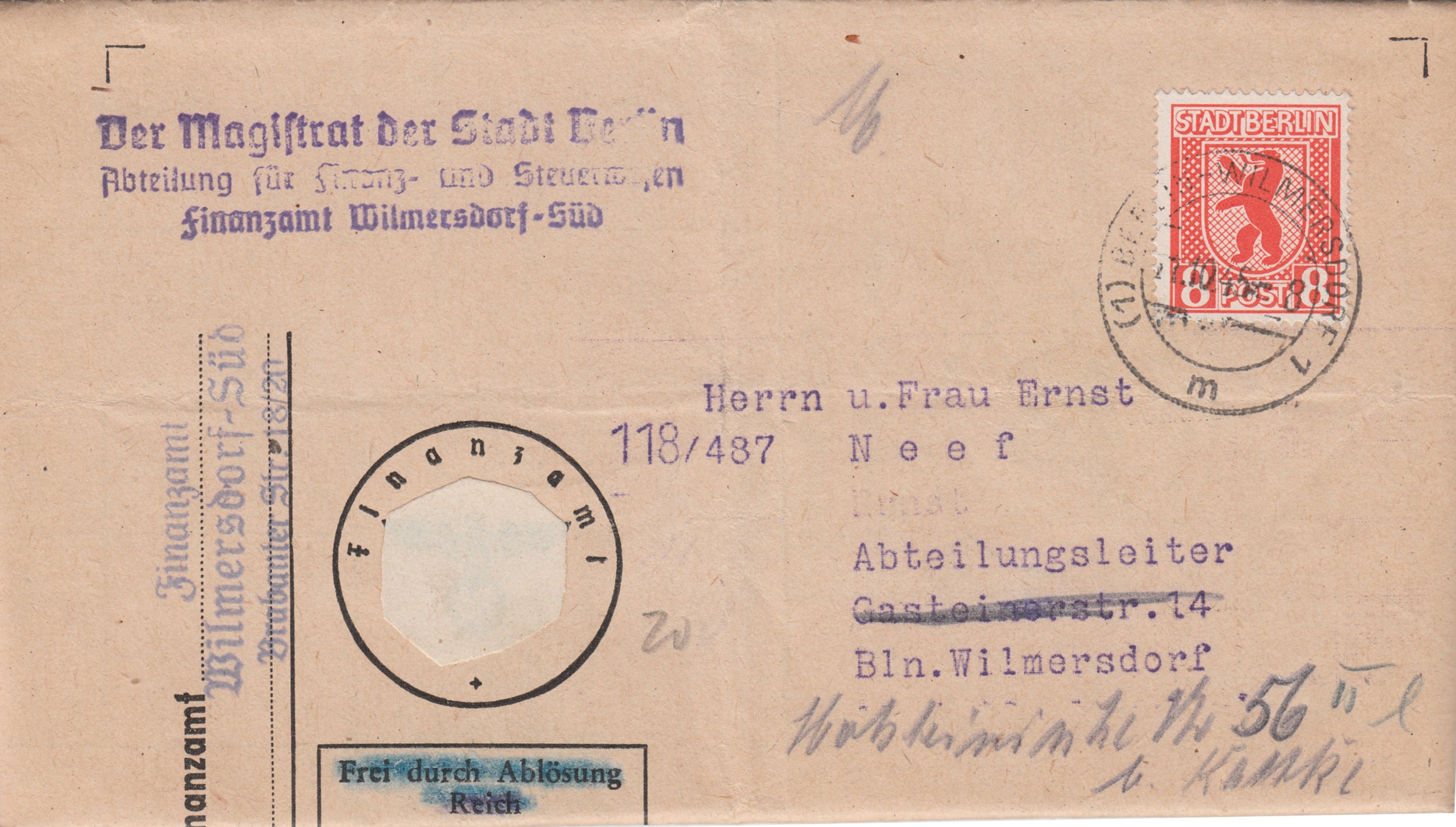 Dieser Brief wurde als Ortsbrief an das Finanzamt in Berlin Steglitz adressiert mit einer Einzelfrankatur des 8 Pf Wertes, MiNr. 3 frankiert am 09.03.1946 in Berlin-Lichterfelde 3 aufgegeben: