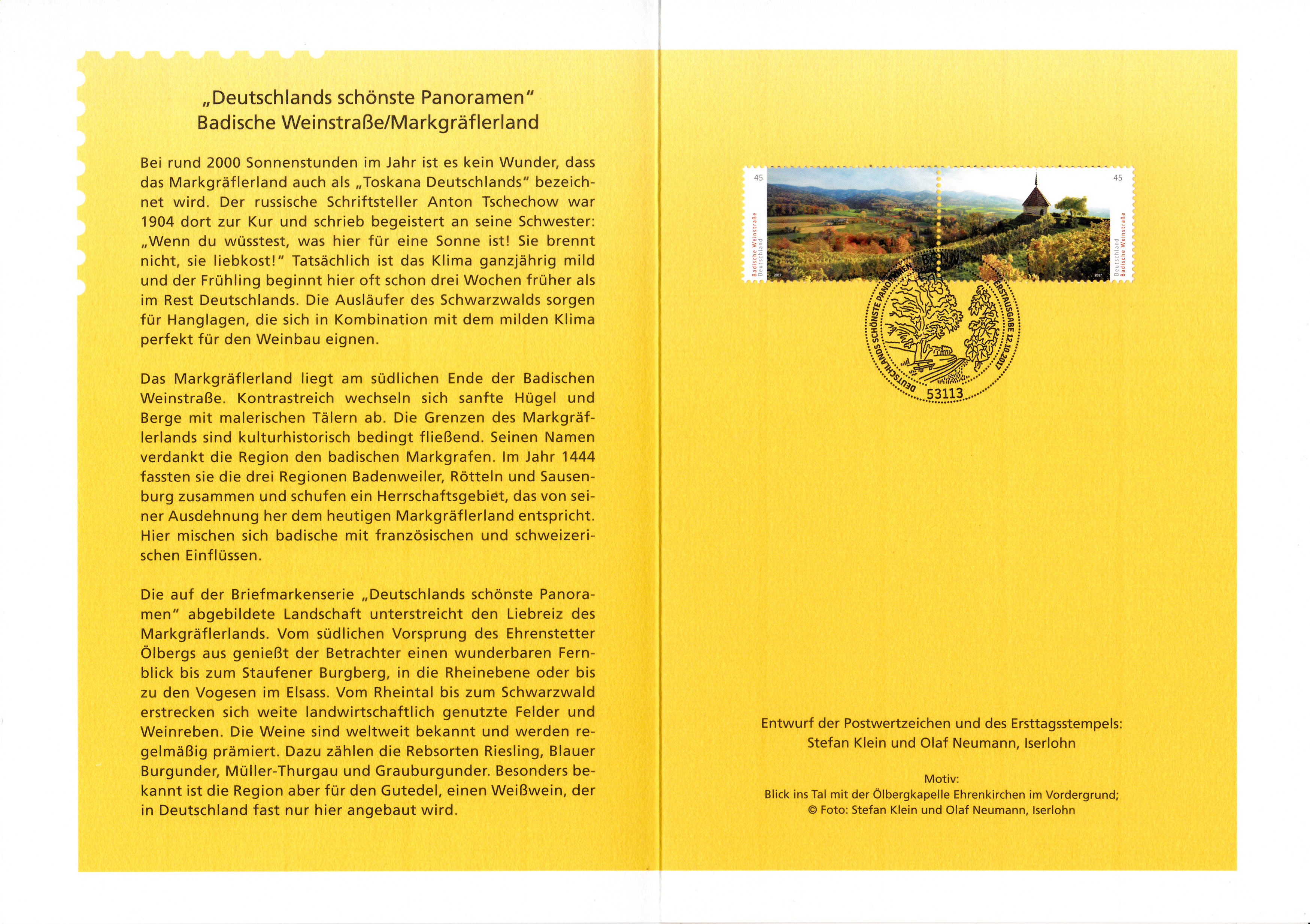 Die Klappkarte des Vorstandsvorsitzenden der Deutschen Post AG mit dem Zusammendruck "Deutschlands schönste Panoramen - Badische Weinstraße - Markgräflerland" hat das Format DIN A 5.