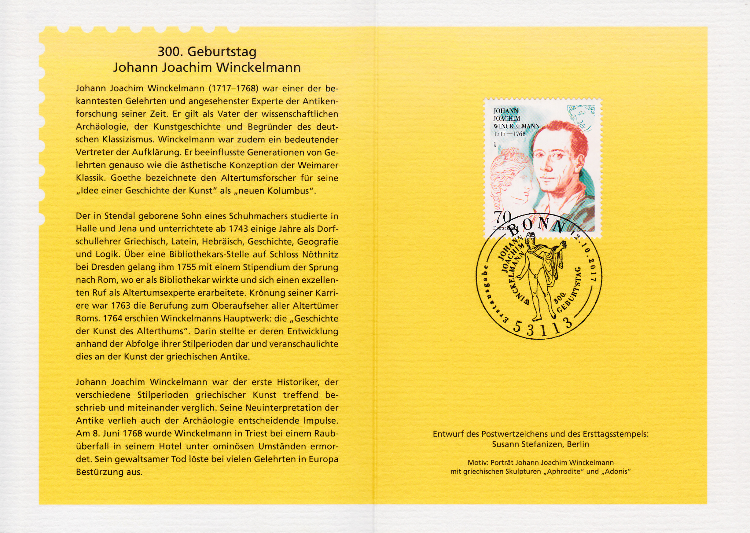 Klappkarte des Vorstandsvorsitzenden der Deutschen Post AG mit der Marke zum 300. Geburtstag von Johann Joachim Winkelmann ist im kleineren DIN A 6 Format.