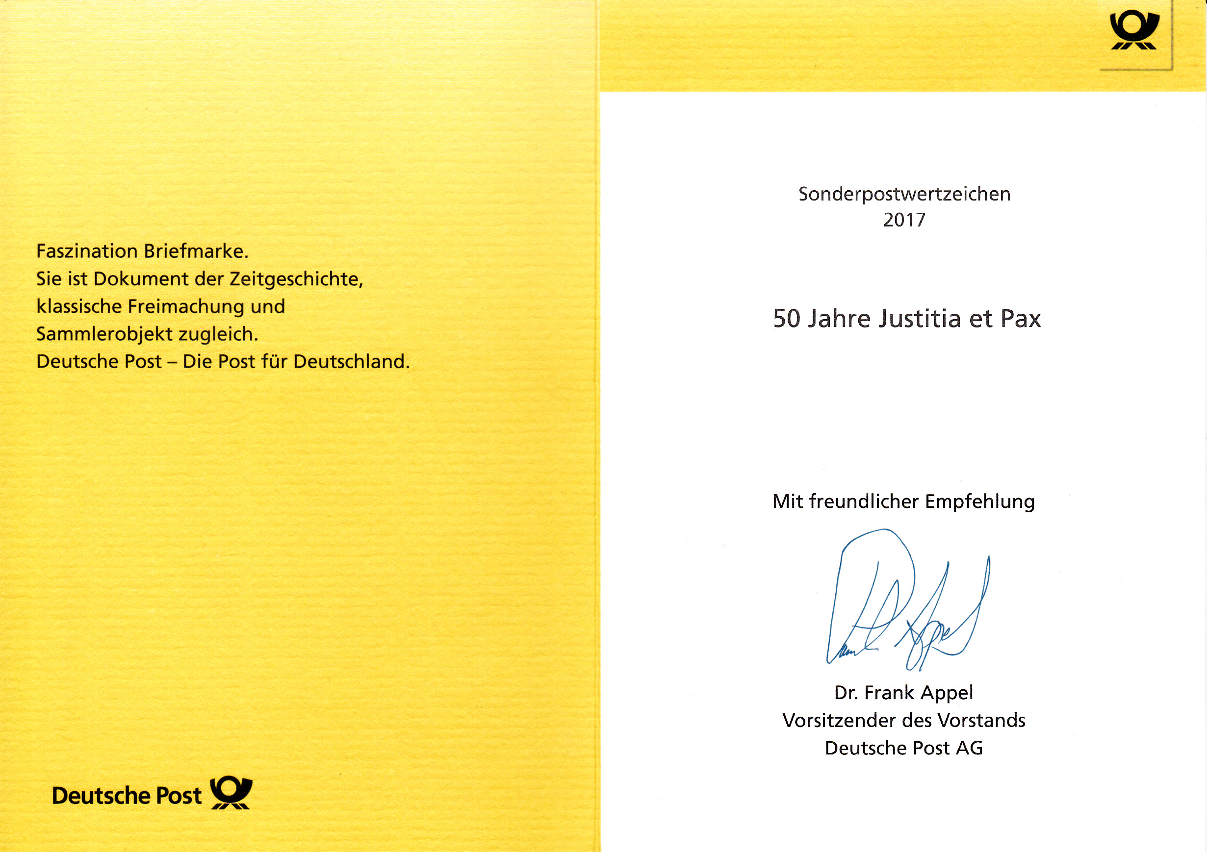 Hier folgt noch die Klappkarte des Vorstandsvorsitzenden der Deutschen Post AG mit der Marke "50 Jahre Deutsche Kommission Justitia et Pax".