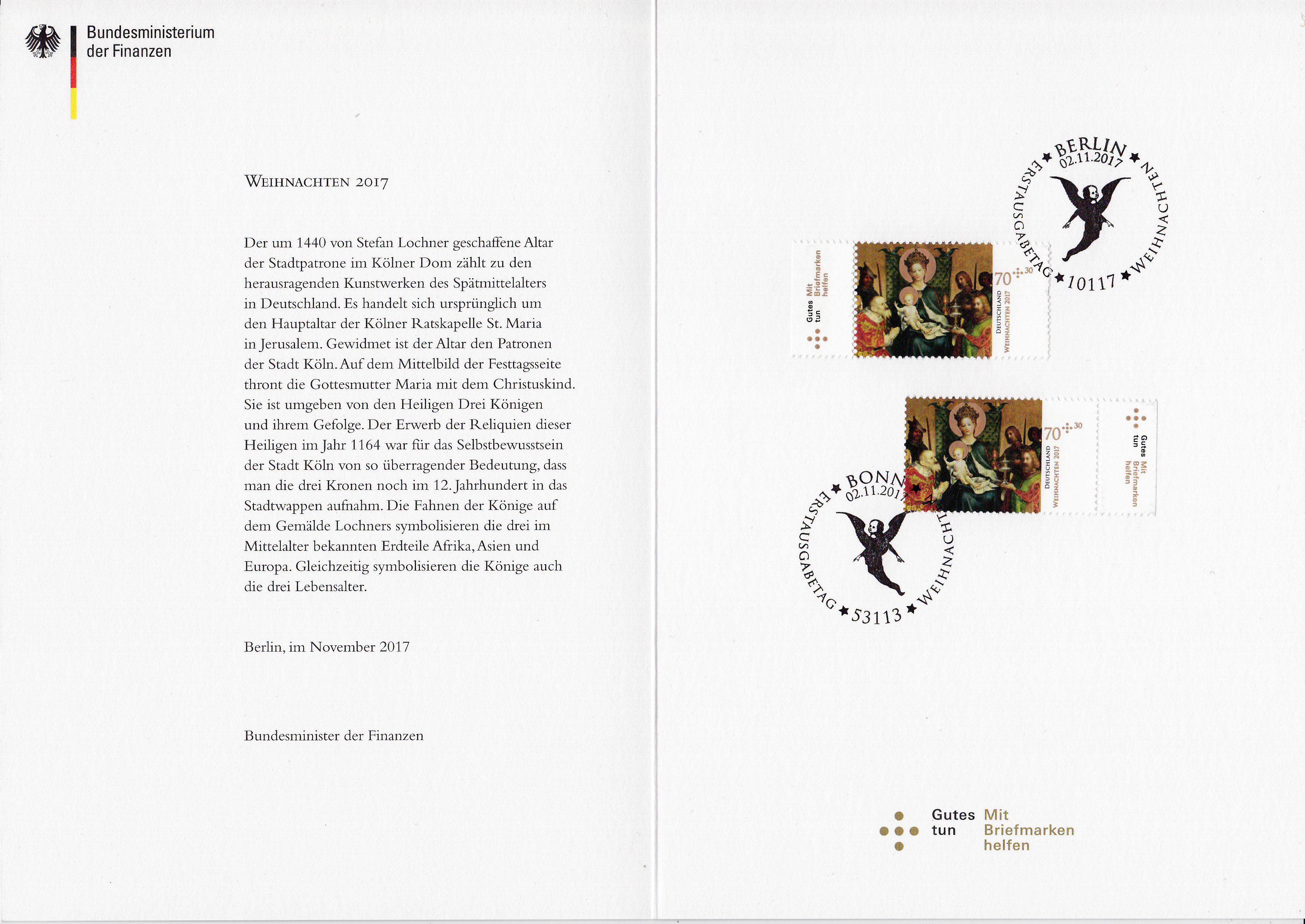 Hier zuerst die farbige Ministerkarte mit der Weihnachtsmarke 2017 und den beiden Ersttagstempel Bonn und Berlin: