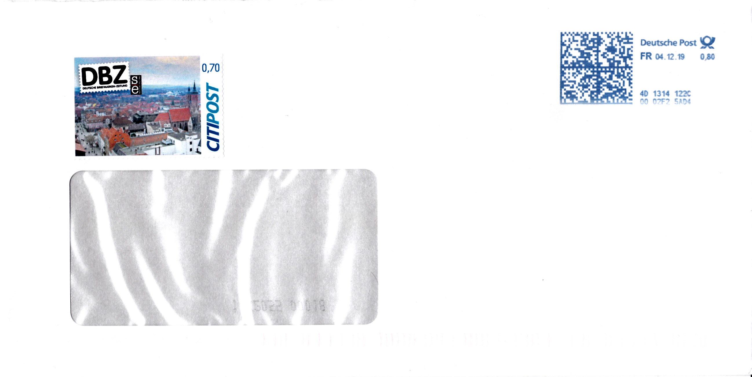 Dieser Briefumschlag ist mit einer Wunschbriefmarke der DBZ zu 0,70€ frankiert. Der Brief wurde von der City-Post mit einem Freistempel der Deutschen Post versehen und dieser zur Beförderung übergeben.