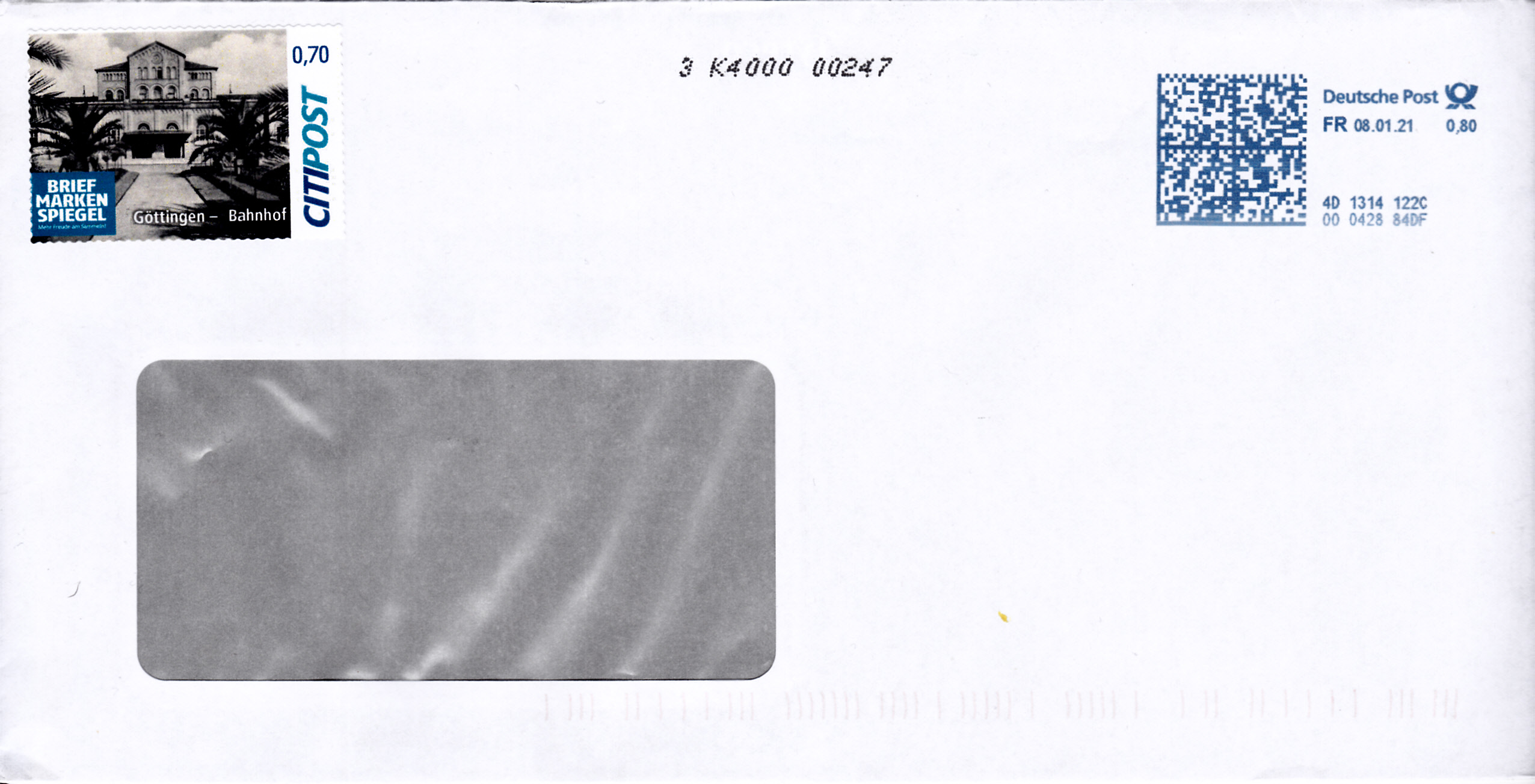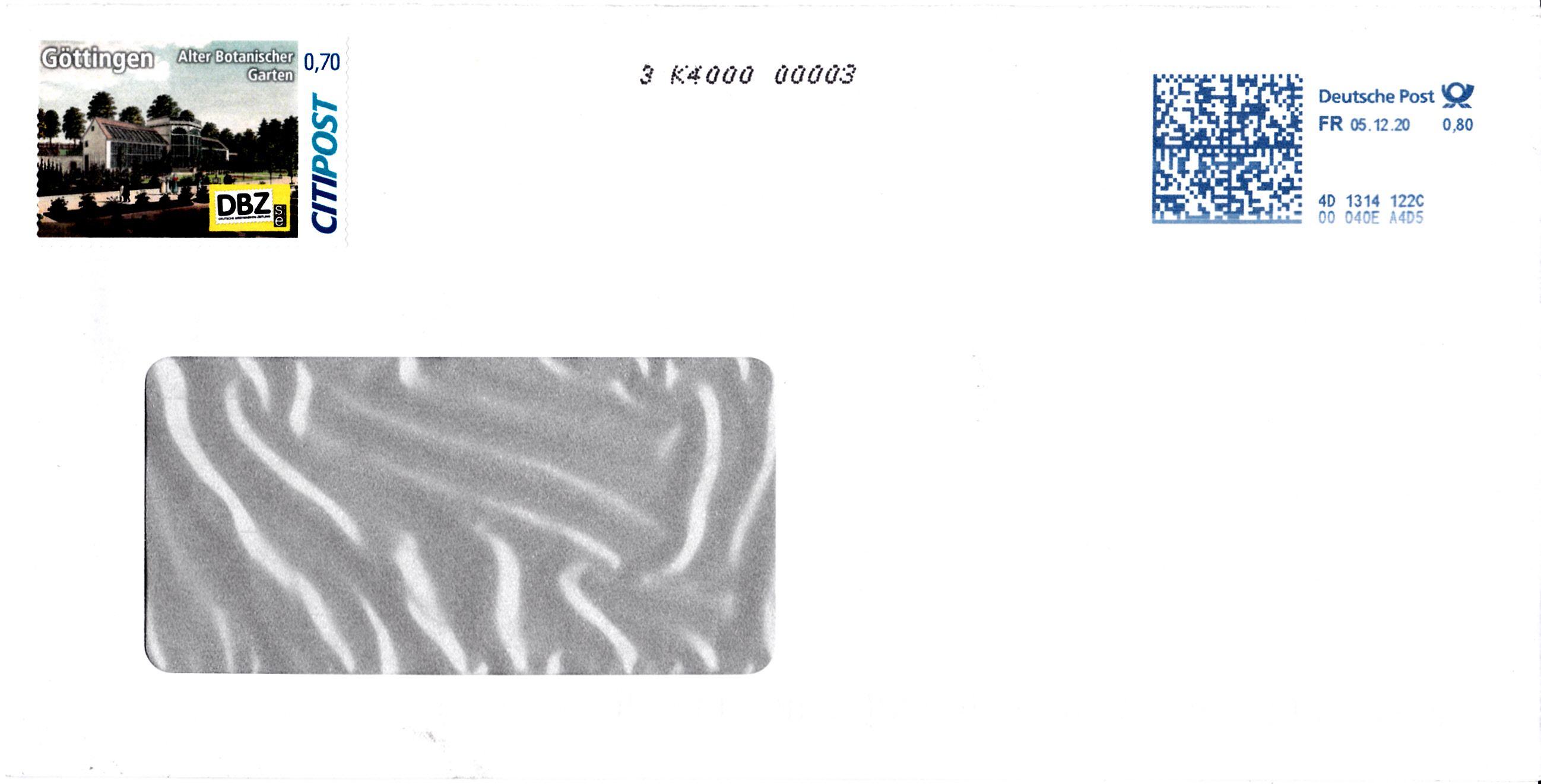 Dieser Briefumschlag ist mit einer Wunschbriefmarke der DBZ zu 0,70€ frankiert. Der Brief wurde von der City-Post am 3.12.2021 mit einem Freistempel zu 0,80€ der Deutschen Post versehen und dieser zur Beförderung übergeben.