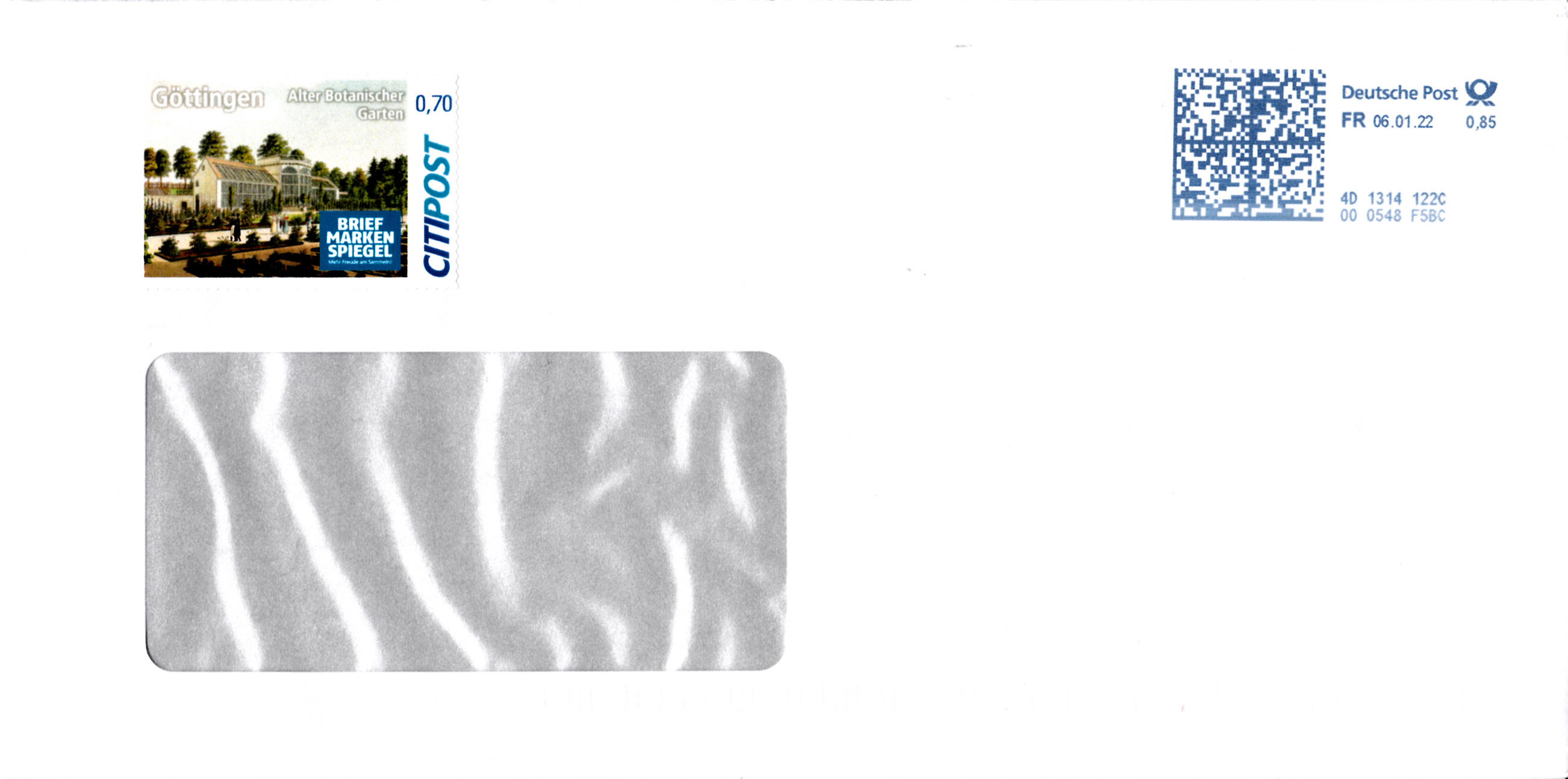 Dieser Briefumschlag ist mit einer Wunschbriefmarke des Briefmarkenspiegel zu 0,70€ frankiert. Der Brief wurde von der City-Post am 6.1.2022 mit einem Freistempel zu 0,85 € der Deutschen Post versehen und dieser zur Beförderung übergeben.