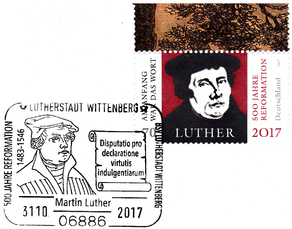 Auch in diesem Sonderstempel vom 31.10.2017 aus Wittenberg ist auf der linken Seite ein Porträt von Martin Luther enthalten.
