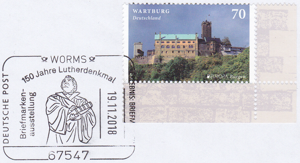 Das Lutherdenkmal in Worms wurde von Ernst Rietschel (Gesamtentwurf sowie die Statuen Luthers und Wyclifs) geschaffen und am 25. Juni 1868 enthüllt. Zum Jubiläum "150 Jahre Lutherdenkmal" wurde am 19.11.2018 in Worms ein Sonderstempel eingesetzt, der einen Teil der Lutherstatue zeigt.