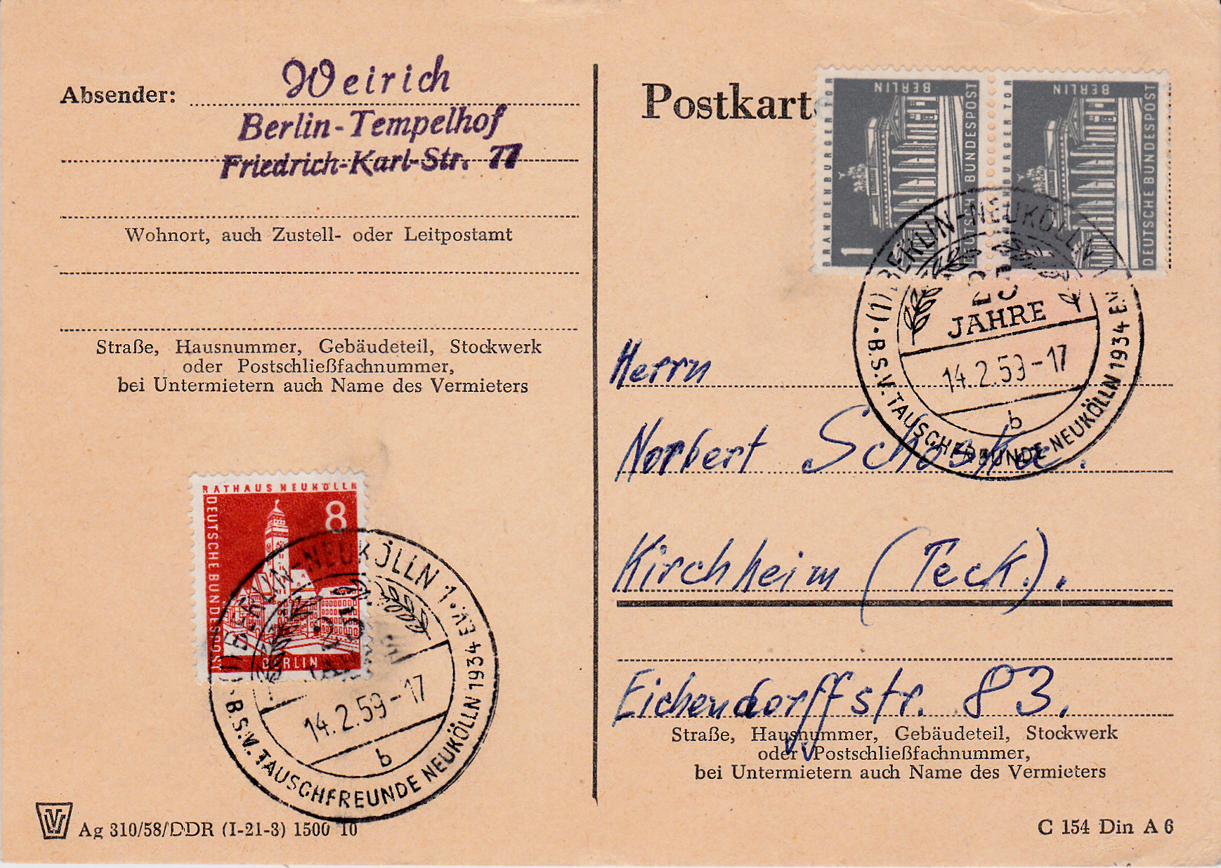 Von 1.9.1948 bis n28.2.1963 betrug das Porto für eine Postkarte im Fernverkehr in der Bundesrepublik Deutschland 10 Pfennig.