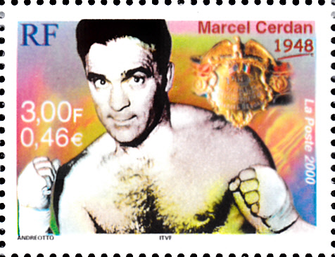 Auf dieser Marke (MiNr 3456) der Serie "Sportliche Ereignisse im 20. Jahrhundert" aus Frankreich wird an den Gewinn der Box-Weltmeisterschaft im Mittelgewicht durch Marcel Cerdan am 21. September 1948 im Kampf gegen Tony Zale erinnert.