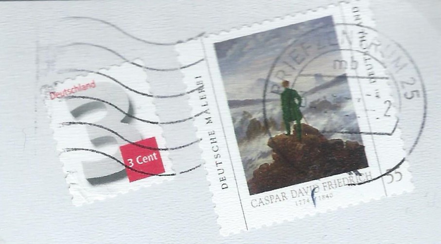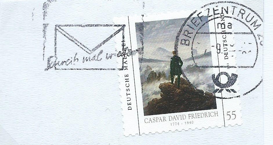 Dann eine Mischfrankatur zwischen einer Marke 55 ct Caspar David Friedrich und Ergänzungswert 3 ct vom BZ 25 auch wieder mit völlig verdrehter Datumszeile: