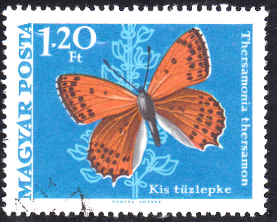 Diese Marke aus Ungarn (MiNr 2498 A) zeigt uns einen Feuerfalter (Thersamonia thersamon).