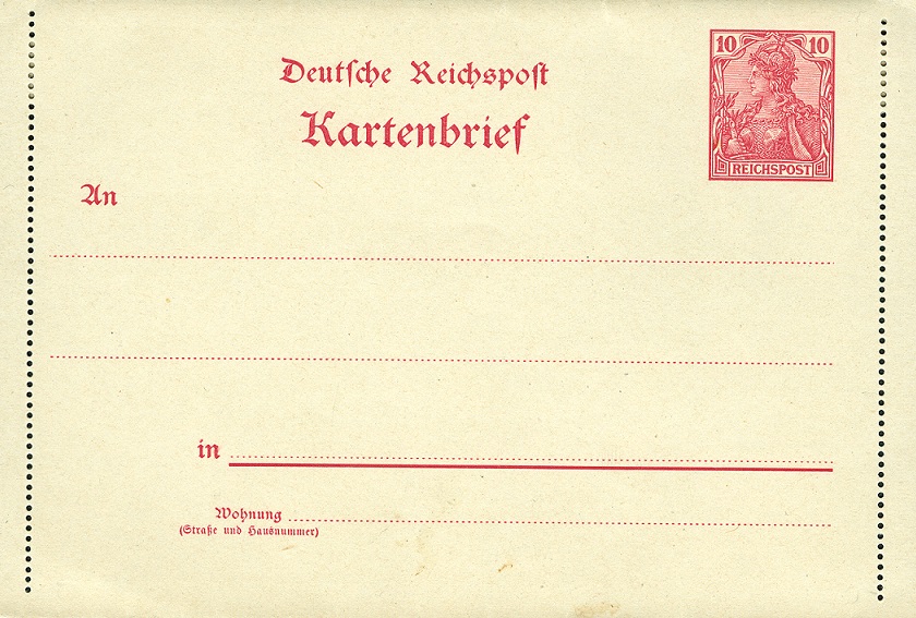 Die Deutsche Reichspost schuf den Kartenbrief als neuen Versendungsgegenstand am 01.11.1897. Von den Postanstalten im Reichspostgebiet wurden bis zum Weltkrieg Vordrucke mit eingedruckten Wertzeichen (zu 10 Pf.) zum Nennwert verkauft.