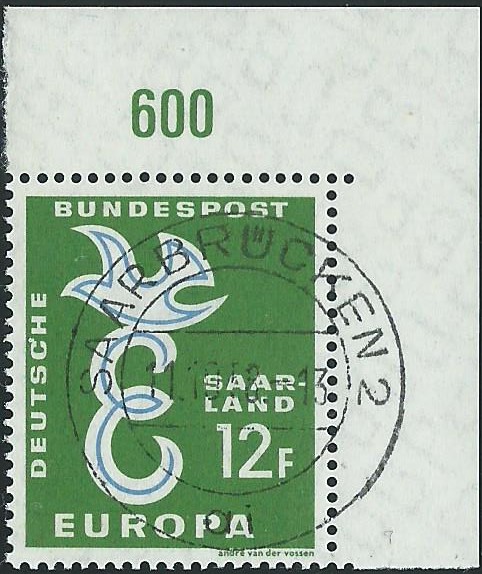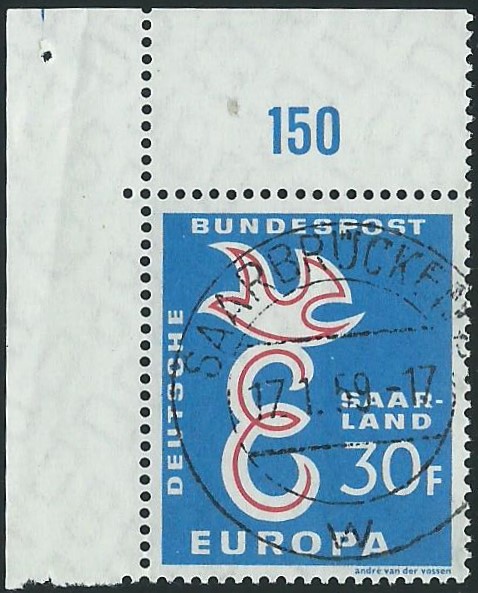 Die Europa-Ausgabe 1958 ist auch wieder mit mehreren Stücken vertreten. Der Wert zu 12 Fr. (Mi.Nr. 439) aus der rechten oberen Bogenecke liegt mir einmal mit Stempel Saarbücken vom 11.10.58 vor.