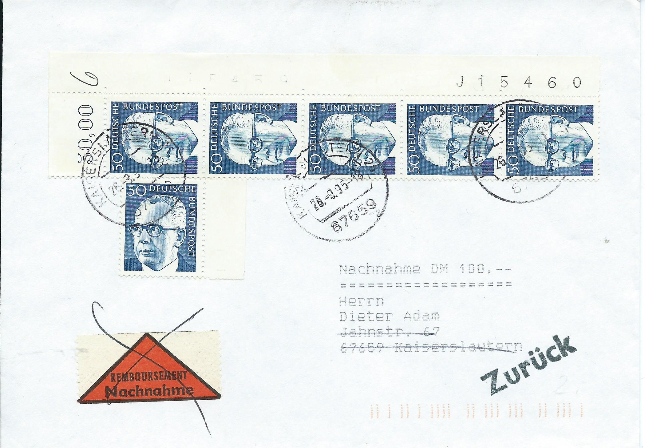 Das verklebte Porto von 23 Pf setzt sich zusammen aus 3 Pf für eine Drucksache plus 20 Pf als Vorzeigegebühr für die Nachnahme.