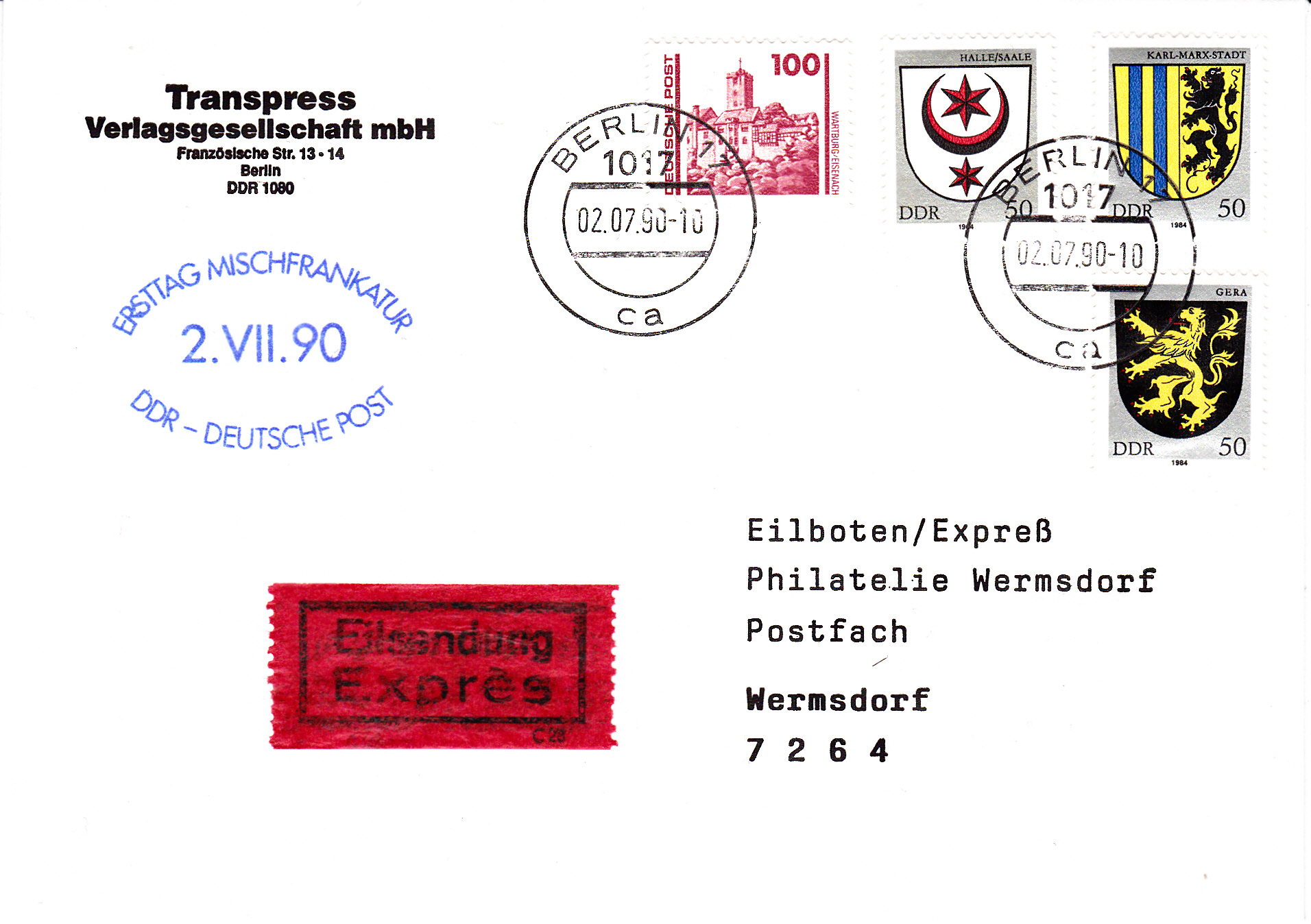 Brief mit einschreiben mit Rückschein vom 12.2.1991 von Königs Wusterhausen nach Mayen. Das Portrombetrug für den Standardbrief 50Pf, für dien Sonderleistungen Einschreiben 150Pf und den Rückschein ebenfalls 150Pf, zusammen also 350Pf, die hier in einer Mischfrankatur mit Marken der DDR (Deutsche Post) und der Bundesrepublik (Deutsche Bundespost) verklebt wurden.