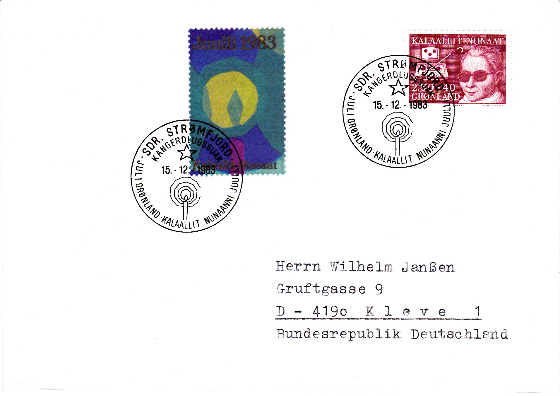Sonderstempel vom 15.12.1983 aus Kangerlussuaq (Grönland), auf dänisch Søndre Strømfjord, zu "Weihnachten in Grönland (JUL I GRONLAND)". Zusätzlich klebt eine Weihnachtsvignette (Jul-Marke) auf dem Umschlag.