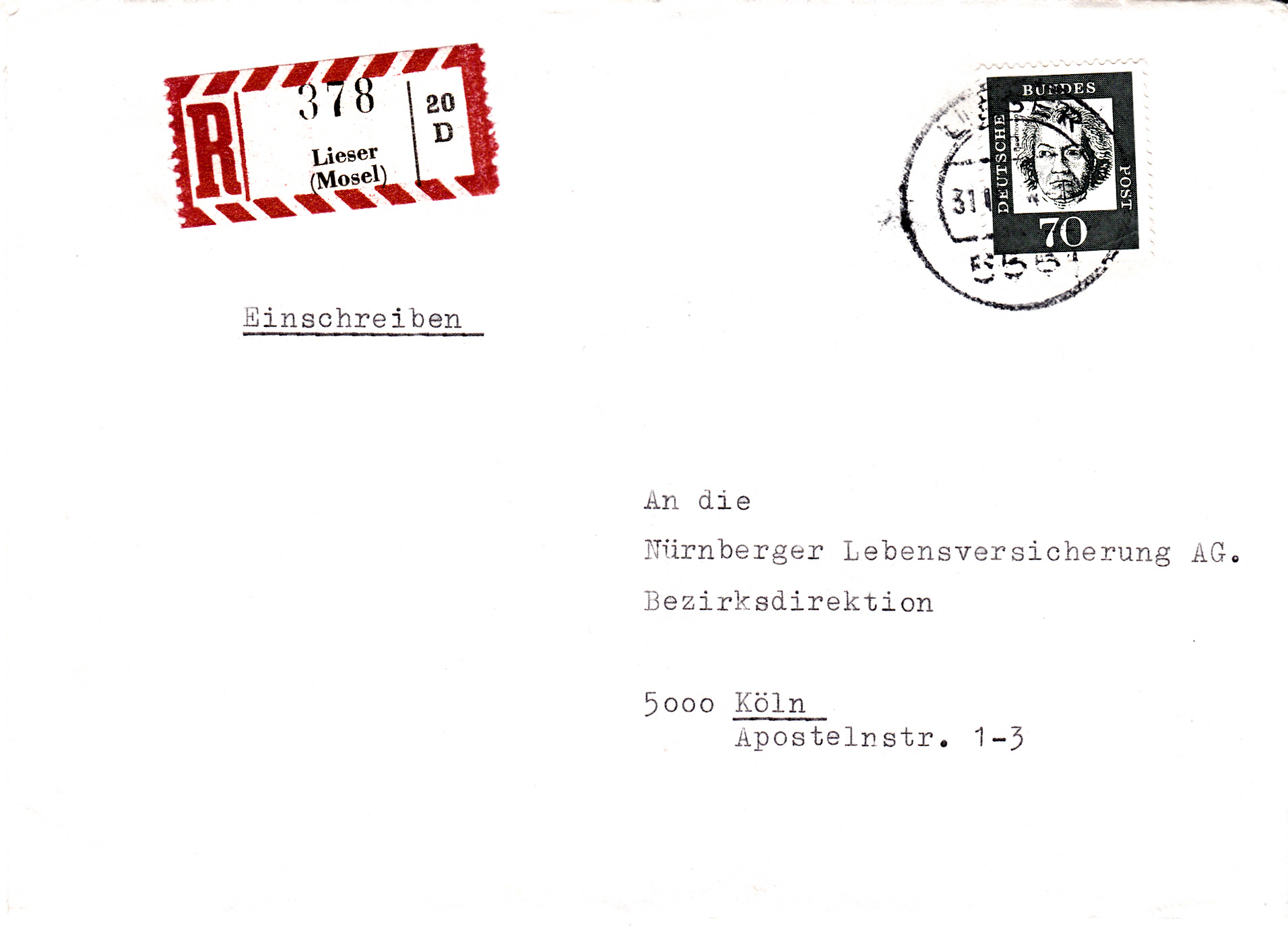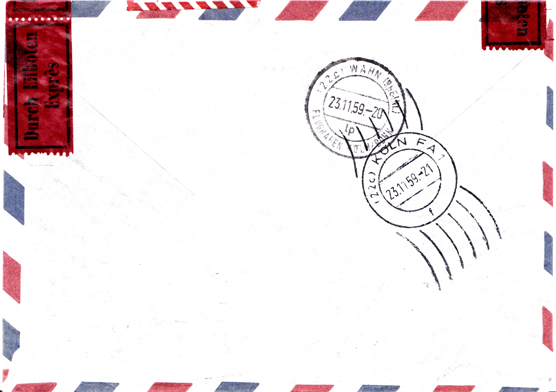 Dieser Brief wurde am 23.11.1959 von Berlin W 30 nach Köln-Nippes mit Luftpost Eilschreiben und Eilboten verschickt. Zum Zeitpunkt der Versendung galten für diese Zusatzleistungen die folgenden Tarife: Luftpost 5Pf, Einschreiben 50Pf (1.7.1954 - 31.3.1966) und Eilboten 60Pf (1.9.1948 - 28.2.1963). Zusammen ergab dies 135Pf. Der Brief ist somit portogerecht frankiert. Die Laufzeit für diesen Brief dauerte nur 11 bis 12 Stunden!!