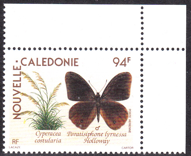 In Neukaledonien ist diese Marke (MiNr 868) mit der Abbildung eines Weibchen des Paratisiphone lyrnessa erschienen. Hier eine Marke vom Eckrand: