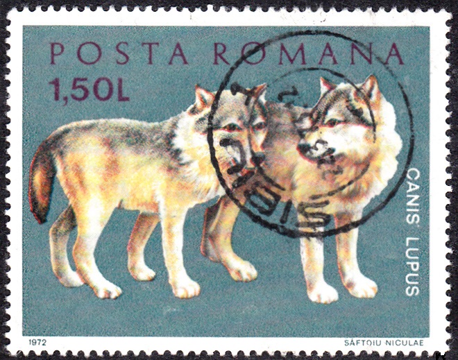 Zwei junge Wölfe (Canis lupus) werden auf dieser Marke aus Rumänien (MiNr 3009) gezeigt.